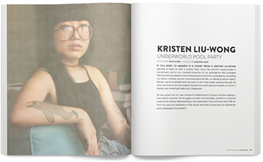 IF YOU WERE TO AWAKEN IN A SCENE FROM A KRISTEN LIU-WONG painting, it might be with a sudden start, much like election results jolted a complacent, and in tum, complicit America. It's no coincidence that Juxtapoz followed with successive covers featuring strong female protagonists, including the latest, a badass women commissioned from Ms. Liu Wong (if you're nasty). Gender equity stumbled back last year, so we must loudly express through art what we know to be true: women should rule, and if you try to grab us where it counts, you should get eaten by a Doberman.