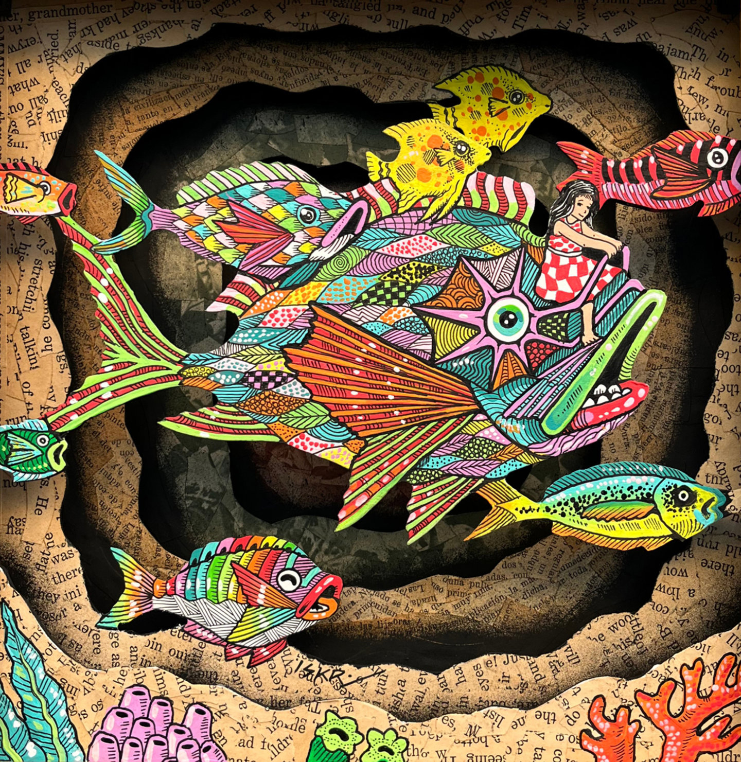 acrylic painting, vintage paper, spray, on acrylic plates mounted in a handcrafted American Cedar wo, 12" x 12"