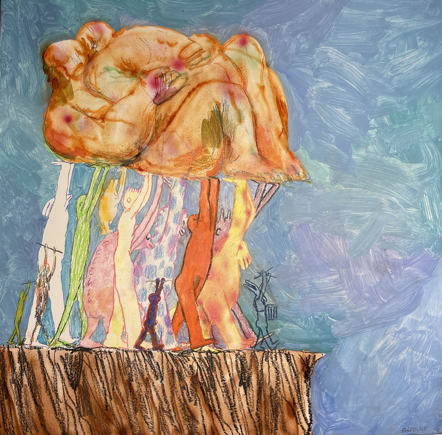 mixed media (acrylic, watercolor, marker, colored pencil) on wood panel, 12" x 12"
