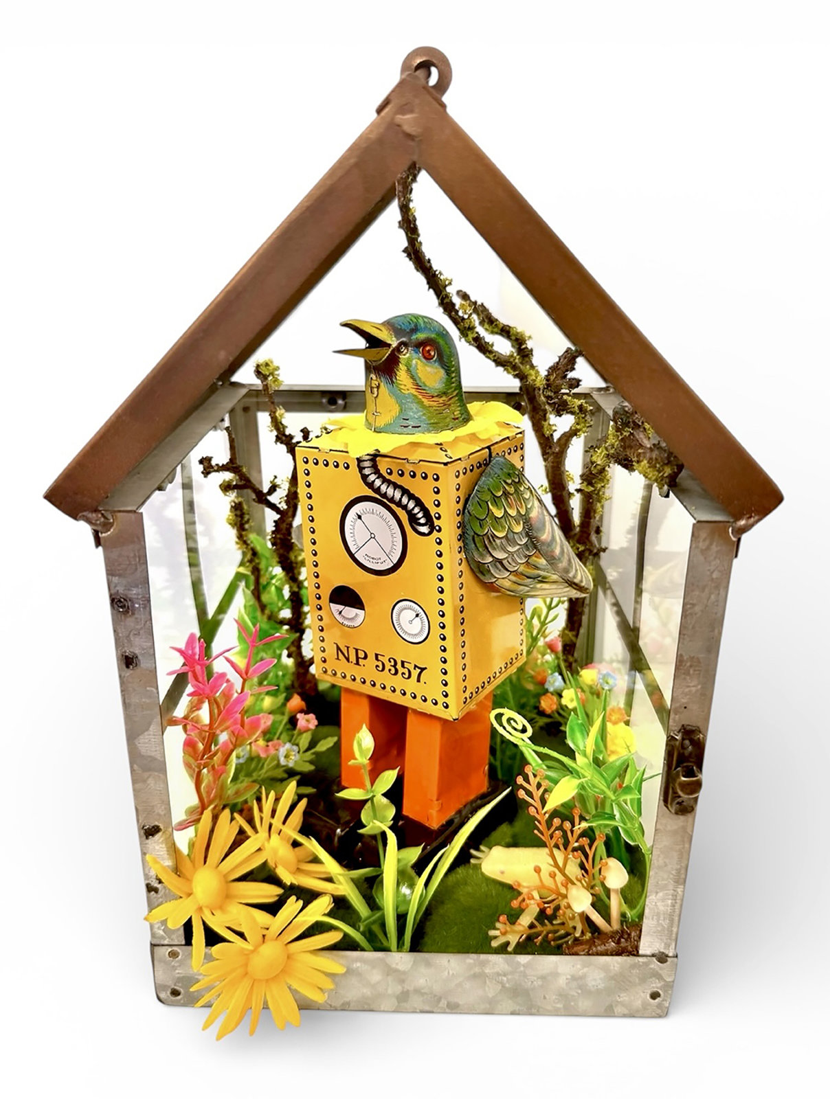 mixed media (metal and plexiglass terrarium, vintage tin litho toys, vintage and assorted plastic pl, 11" (h) x 7.5" (w) x 6.75" (d)