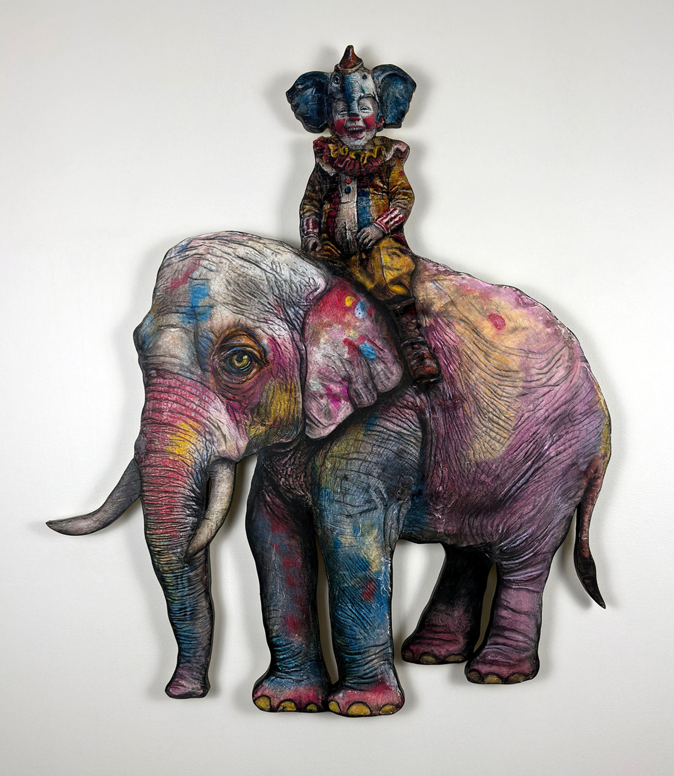 ink, watercolor, acrylic, charcoal, pastel and plaster on hand cut wood, 36.75" x 31.75"