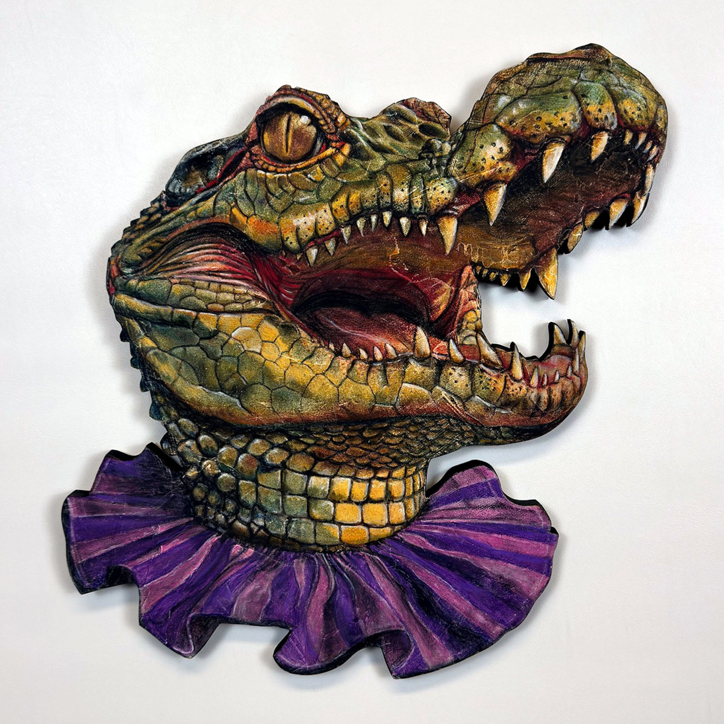 ink, watercolor, acrylic, charcoal, pastel and plaster on hand cut wood, 20.5" x 19"
