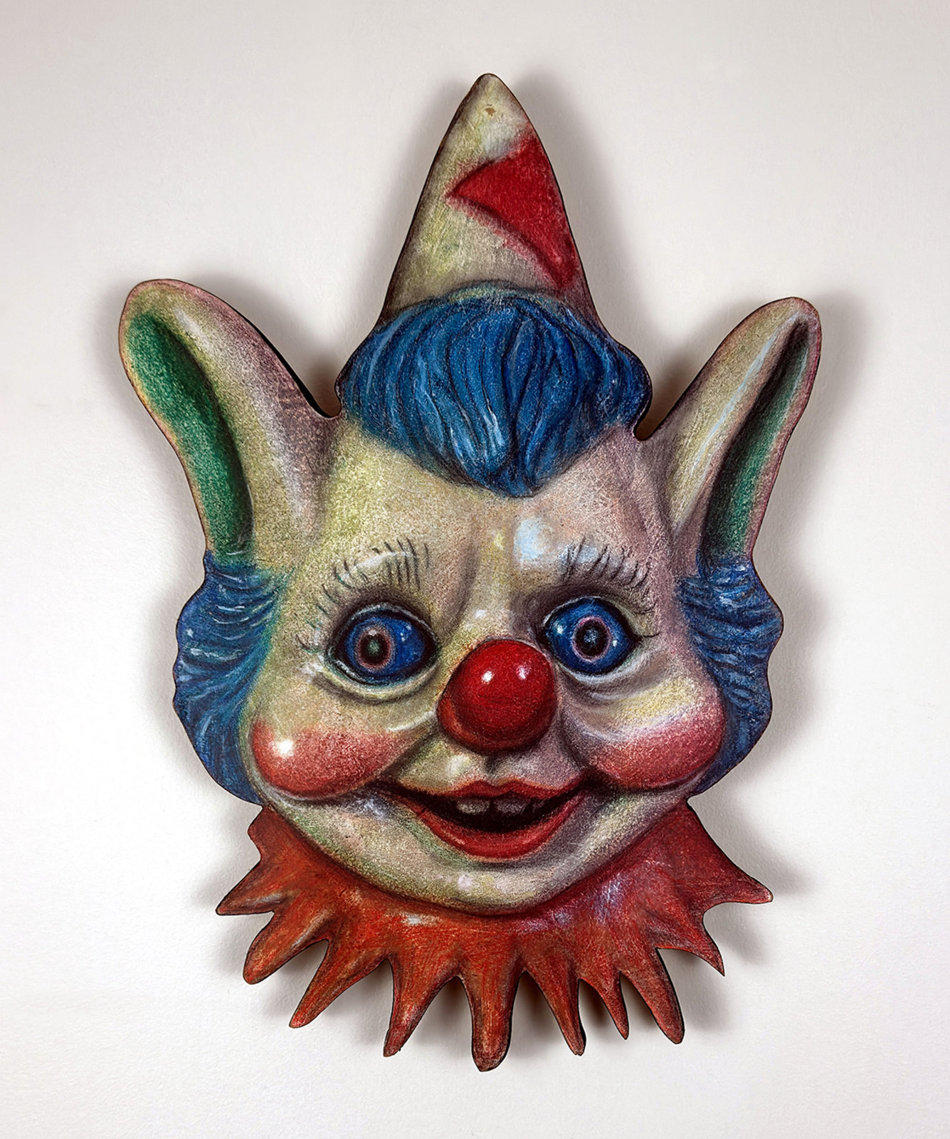 ink, watercolor, acrylic, charcoal, pastel and plaster on hand cut wood, 19" x 13.25"