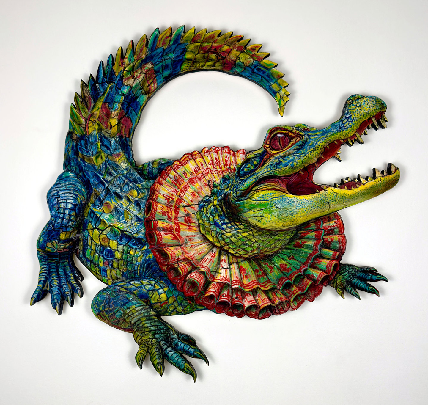 ink, watercolor, acrylic, charcoal, pastel and plaster on hand cut wood, 30" x 34"