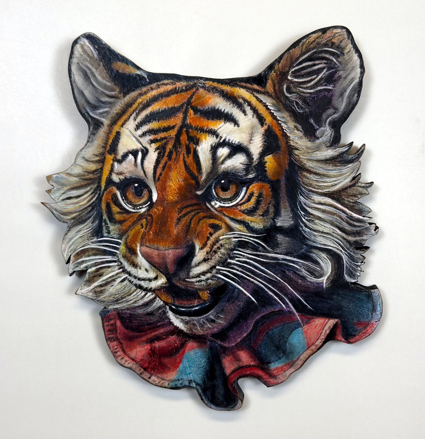 ink, watercolor, acrylic, charcoal, pastel and plaster on hand cut wood, 16.5" x 14.5"