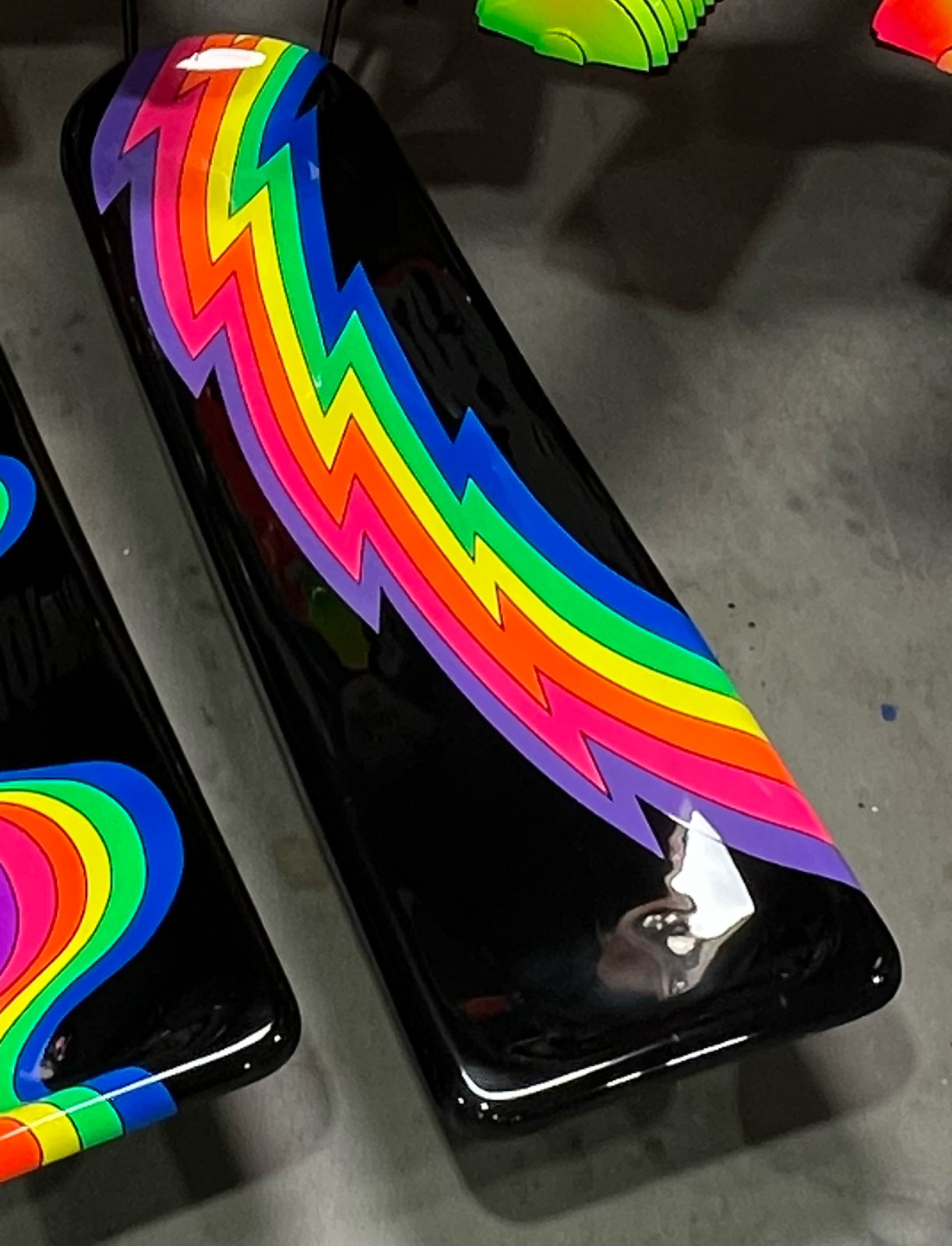 original Fibrella mid-century recliner lounge chair painted in House of Kolor Neon paint and House o, 16" high x 6' 6" long x 23" wide