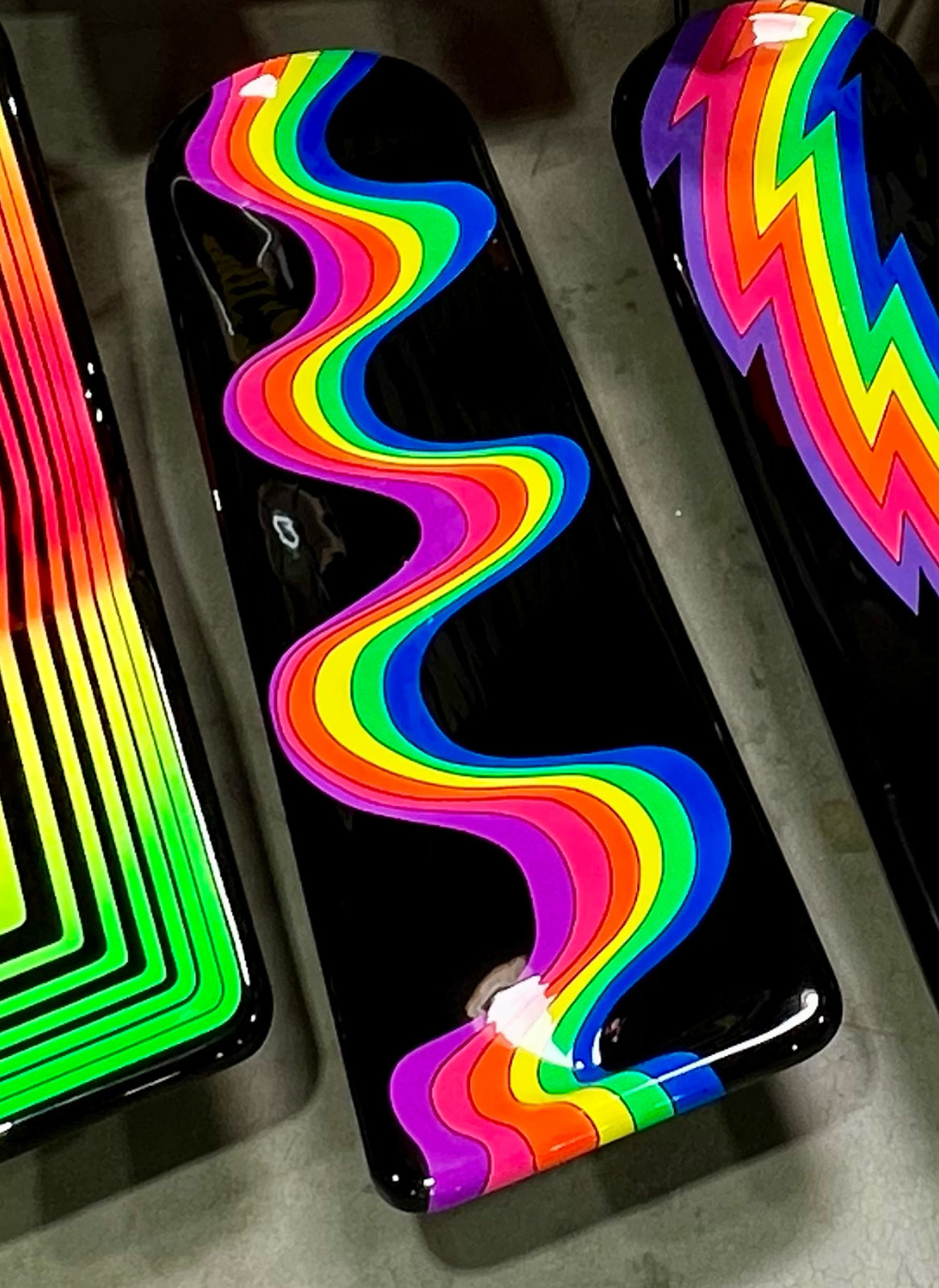 original Fibrella mid-century flat lounge chair painted in House of Kolor Neon paint and House of Ko, 16" high x 6' 6" long x 23" wide