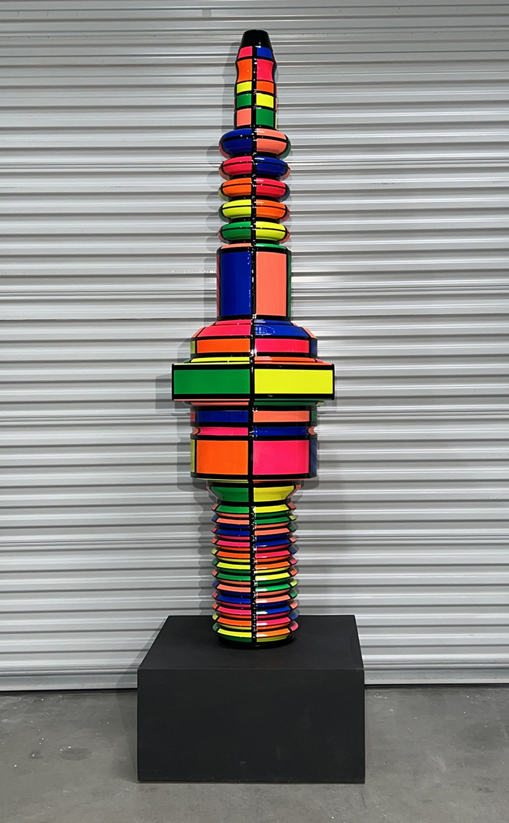 fiberglass painted in House of Kolor Neon paint and HOK Show Clear with a steel base, 8' (h) x 30" (w) x 30" (d)