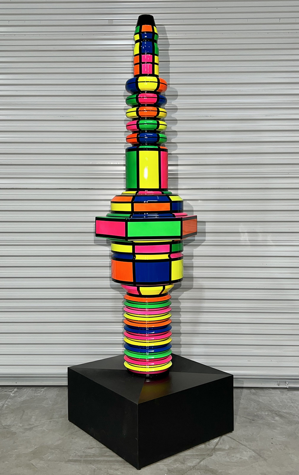 fiberglass painted in House of Kolor Neon paint and HOK Show Clear with a steel base, 8' (h) x 30" (w) x 30" (d)