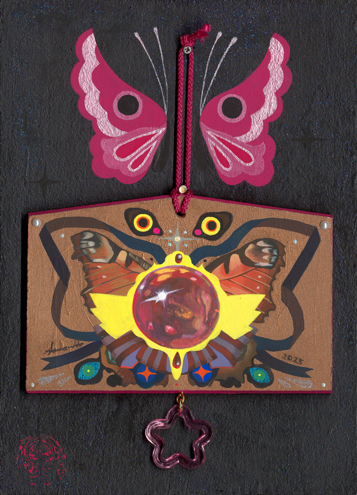 acrylic, mixed media panel and Ema (wooden plaque), 9" x 6.25"